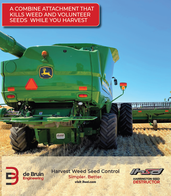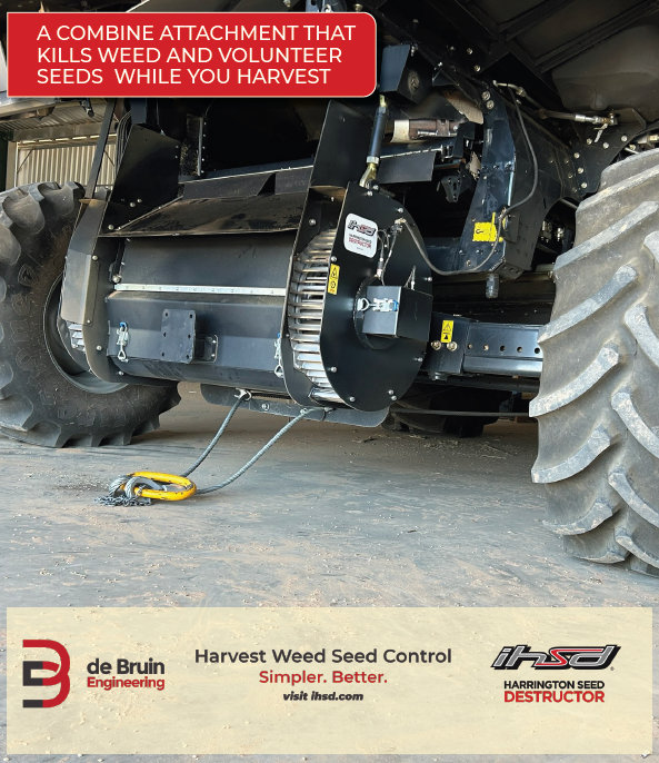 iHSD is installed on the rear of a combine harvester and processes the chaff destroying weed seeds contained in the trash and providing harvest time weed control, preventing the vast majority of weed seeds encountered from entering the soil seed bank. The fully integrated system when purchased includes all base components to fit the combine harvester. Including pulleys, jackshafts, straw baffles, belts and monitoring system.